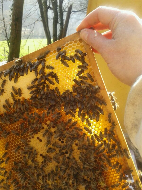 Wir bieten den Bienen u. a. die Möglichkeit zum Naturwabenbau. D. h. wir hängen komplett leere Rahmen in den Bienenstock, den die Bienen nach eigenen Bedürfnissen ausbauen.